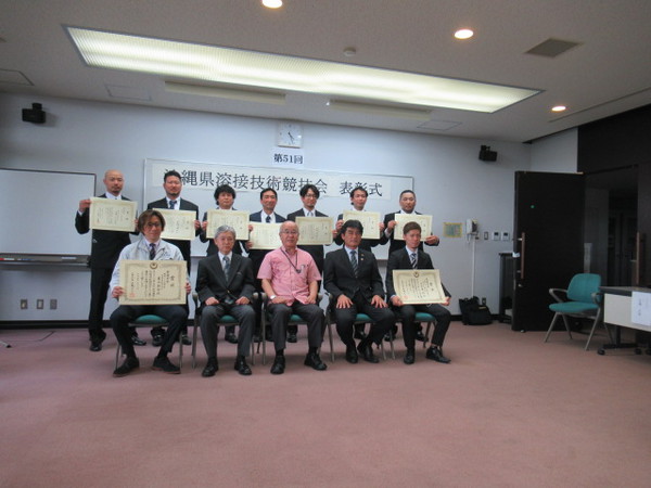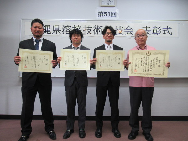沖縄県工業技術センターにて「第51回 沖縄県溶接技術競技会表彰式」が行われ、弊社工事部の亀浜 朝弥氏、森山 優也氏、福地 友之輔氏、屋宜 泰成氏が表彰されました!(亀浜さんは欠席のため代理受賞)