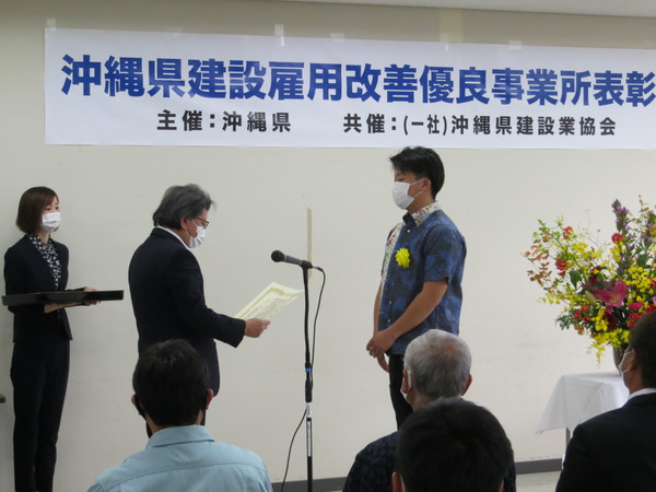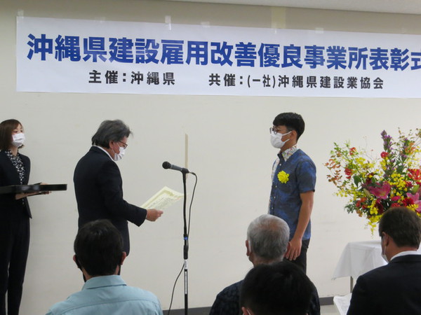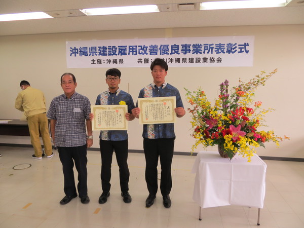 沖縄県庁にて「令和2年度 沖縄県建設雇用改善優良事業所表彰式」が行われ、弊社工事部の福地 友之輔氏、鍬野 怜音氏が表彰されました。